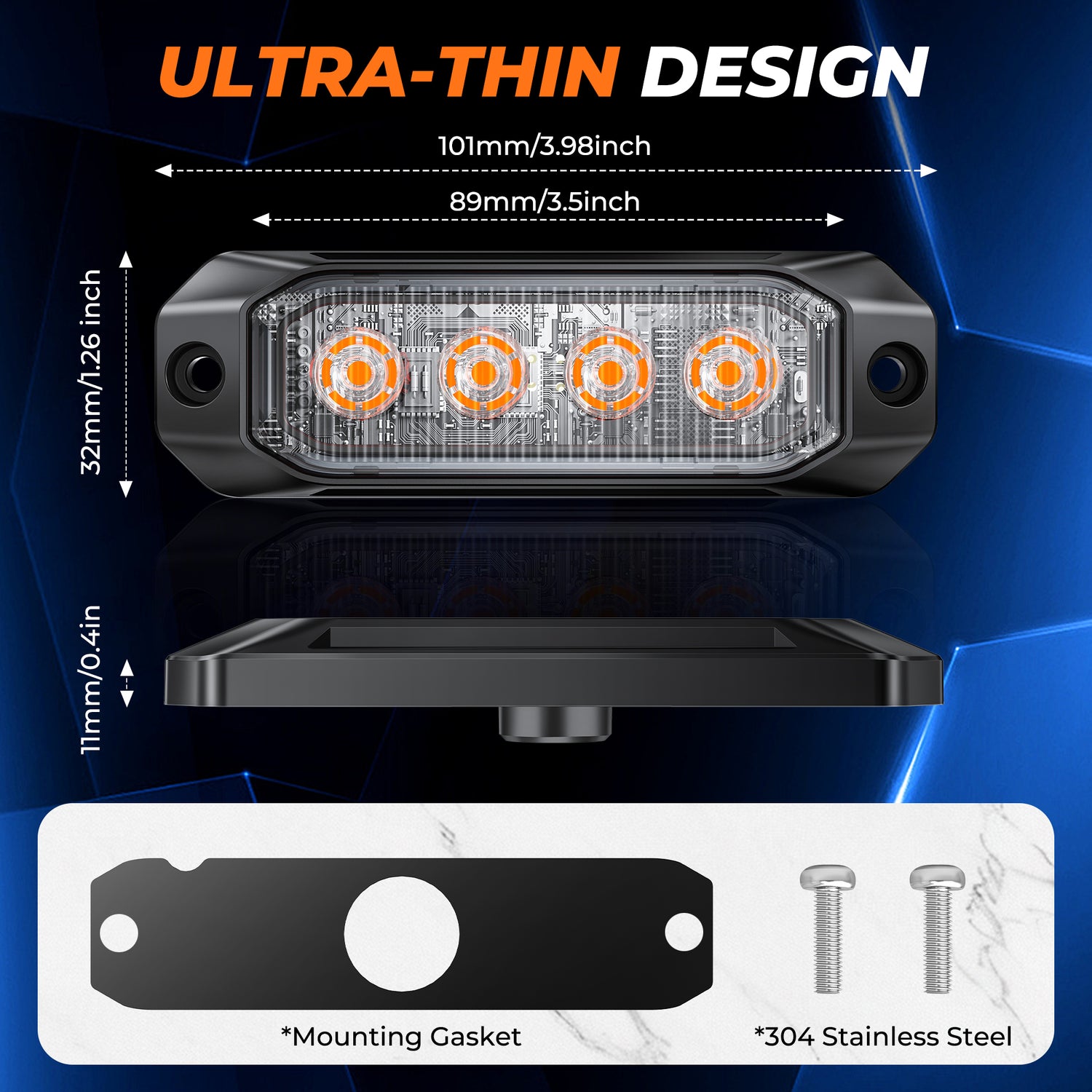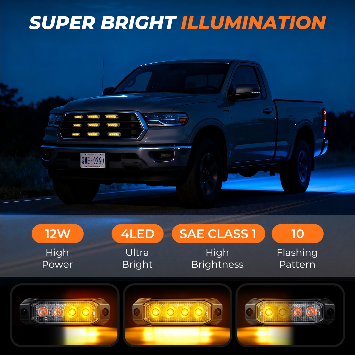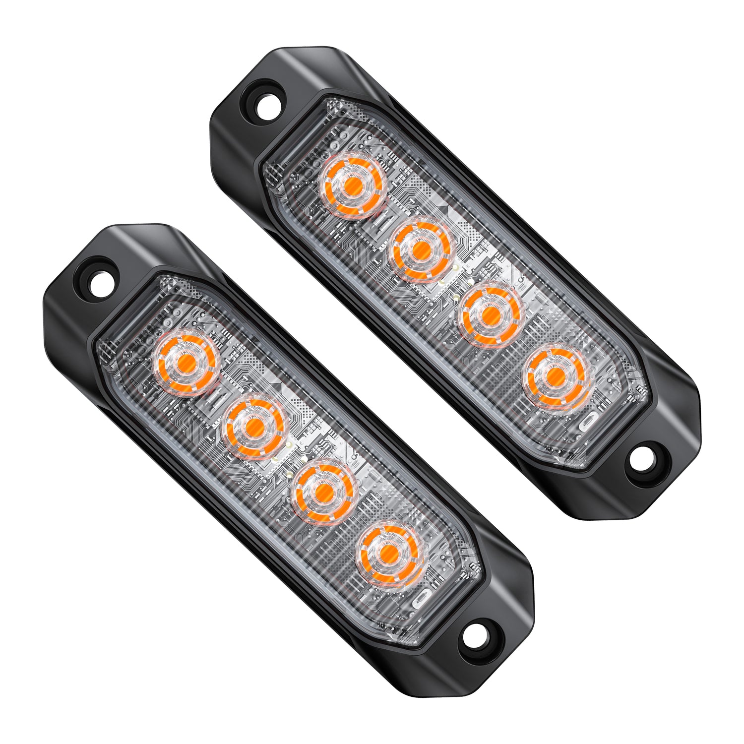 Optical Performance & Compliance Equipped with 4 high-intensity LED chips per unit and precision-engineered PC lenses, this system delivers superior brightness that meets rigorous SAE Class 1 standards. The amber output is optimized for maximum candela, providing critical warning signals for professional emergency and utility applications.